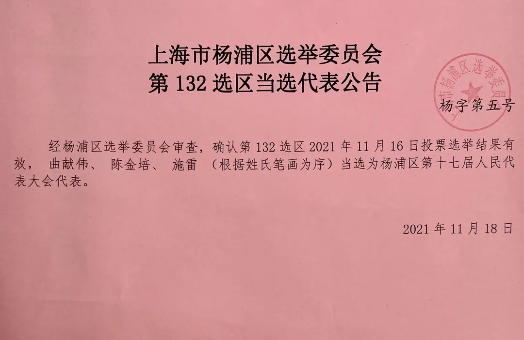 經(jīng)楊浦區(qū)選舉委員會審查,確認(rèn)第132選區(qū)2021年11月16日投票選舉結(jié)果有效,上海復(fù)旦微電子集團(tuán)股份有限公司董事總經(jīng)理施雷當(dāng)選為楊浦區(qū)第十七屆人民代表大會代表。